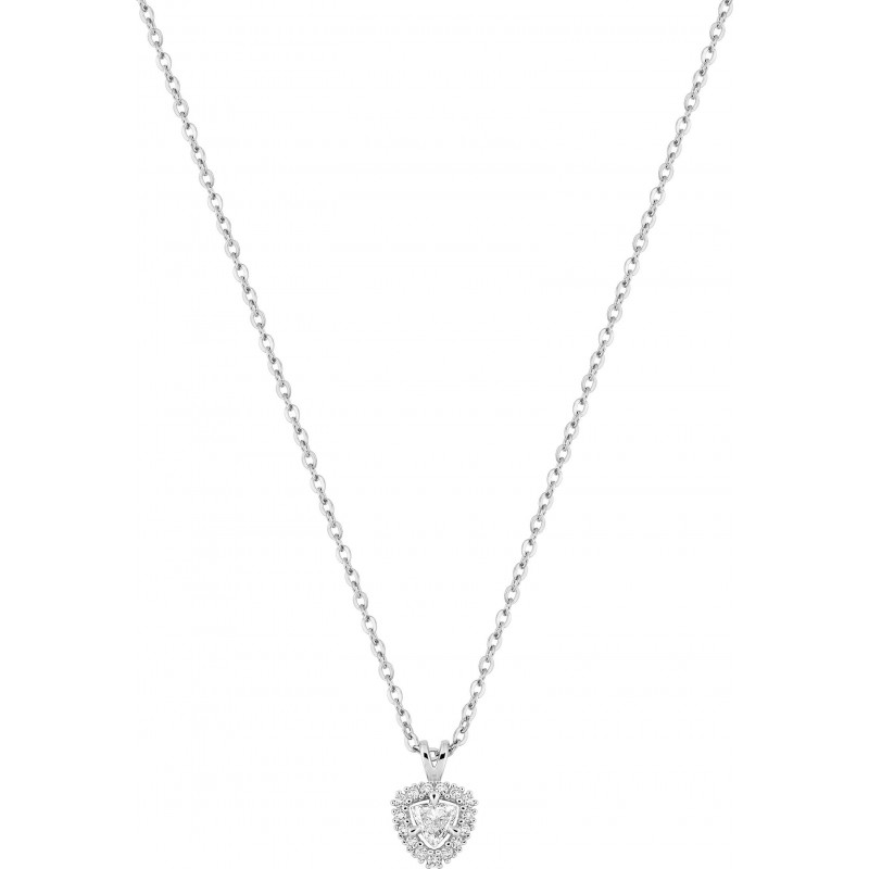 Collier en or 375/1000 blanc avec pendentif sertis de diamants de laboratoire (0.13ct) sur chaine maille forçat. Fermoir anneau ressort. Longueur ajustable de 40cm à 45cm. Poids: 1.45g.