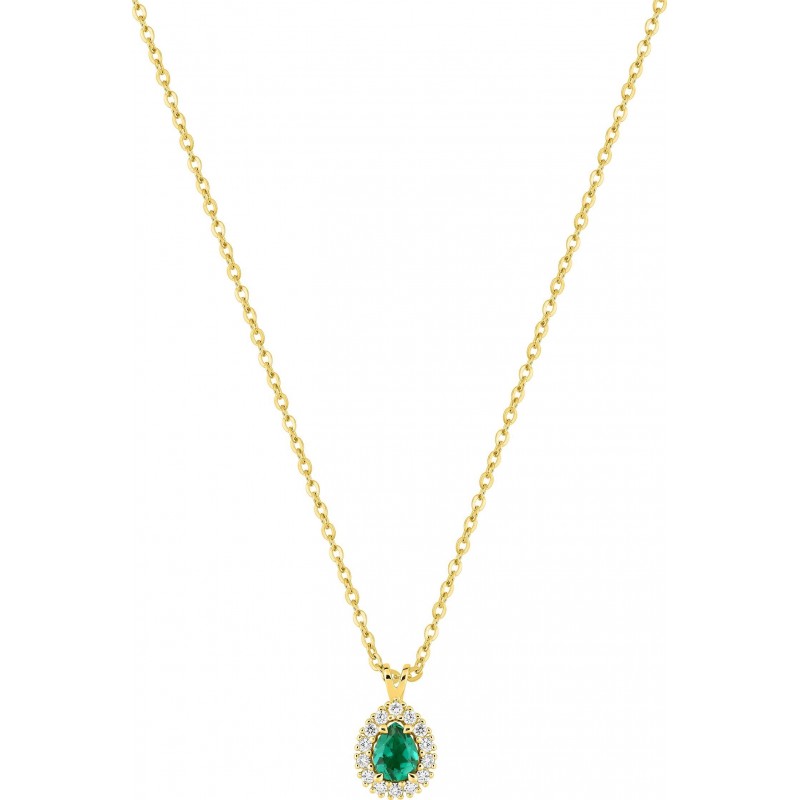 Collier en or 375/1000 jaune avec pendentif sertis d'une émeraude de laboratoire et de diamants de laboratoire (0.07ct) sur chaine maille forçat. Fermoir anneau ressort. Longueur ajustable de 40cm à 45cm. Poids: 1.45g.