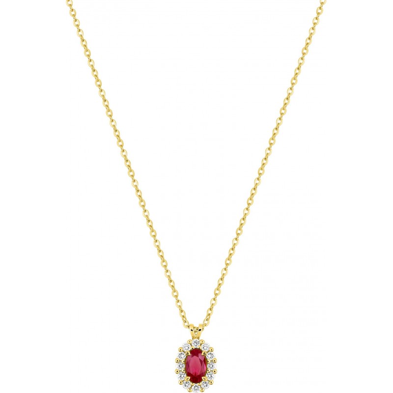 Collier en or 375/1000 jaune avec pendentif sertis d'un rubis de laboratoire et de diamants de laboratoire (0.16ct) sur chaine maille forçat. Fermoir anneau ressort. Longueur ajustable de 40cm à 45cm. Poids: 1.60g.