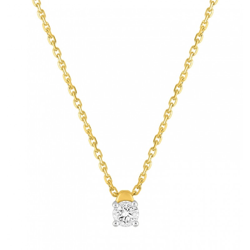 Collier en or 750/1000 jaune avec pendentif solitaire diamant (0.15ct) sur chaine maille forçat. Fermoir anneau ressort. Longueur 42cm. Poids: 1.85g