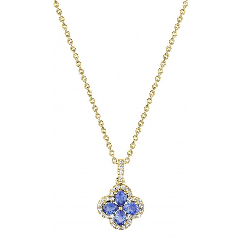 Collier en or 750/1000 jaune avec pendentif en forme de trèfle sertis de diamants (0.20ct) et de saphirs de ceylan (3mm) sur chaine maille forçat. Fermoir anneau ressort. Longueur ajustable de 40cm à 42cm. Poids: 4.10g