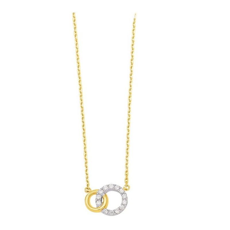 Collier en plaque or avec pendentif ronds entrelacés serti d'oxydes de zirconium sur chaine maille forçat. Fermoir anneau ressort. Longueur 42cm.