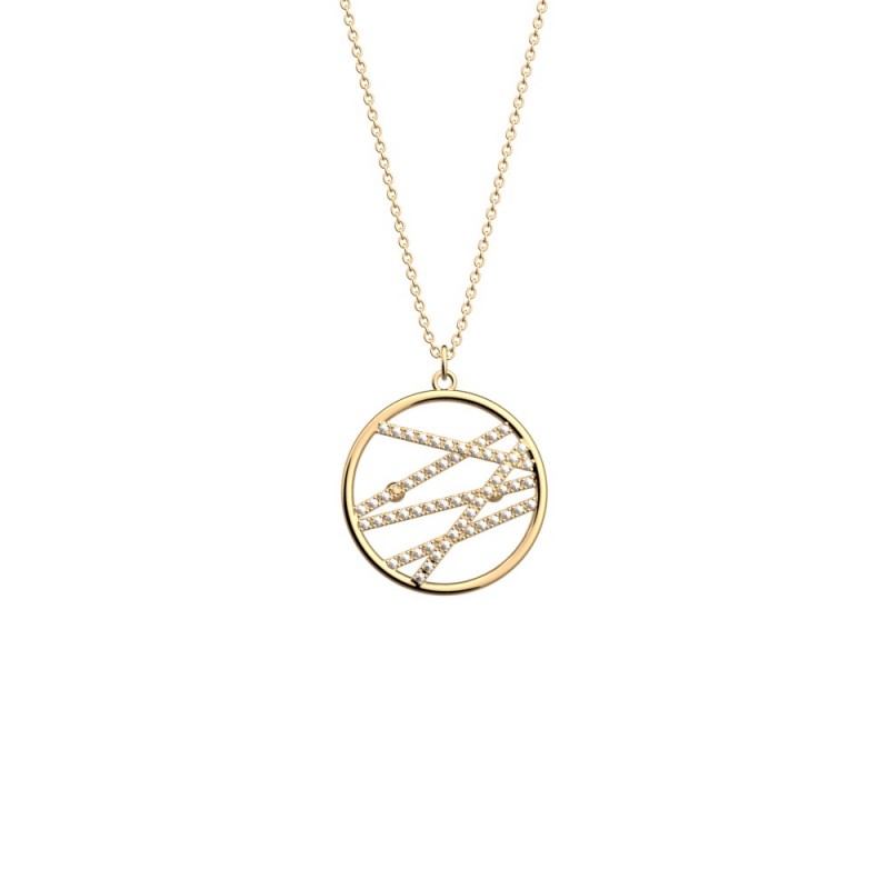 Collier LES GEORGETTES "Liens", en laiton doré et oxydes de zirconium, avec pendentif moyen rond 25mm, avec chaine maille forçat. Fermoir anneau ressort. Longueur ajustable de 45cm à 50cm.