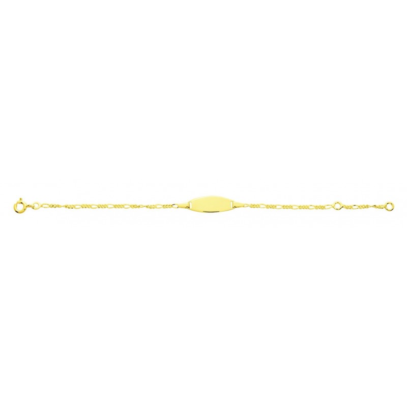 Gourmette bébé en or 375/1000 jaune. Fermoir anneau ressort. Longueur ajustable à 12cm et 14cm. Poids: 1.40g