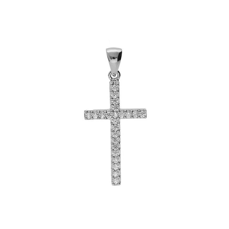 Croix en argent 925/1000 rhodié avec oxydes de zirconium, sur bélière mobile. Poids: 1.81g.