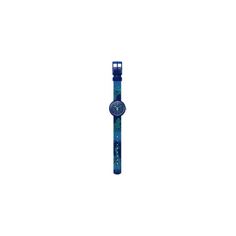 Montre FLIK FLAK, Mouvement quartz, boitier plastique (diam. 30mm), fond bleu, bracelet textile bleu et vert avec dinosaures. Etanchéité: 3 ATM. Garantie 2 ans