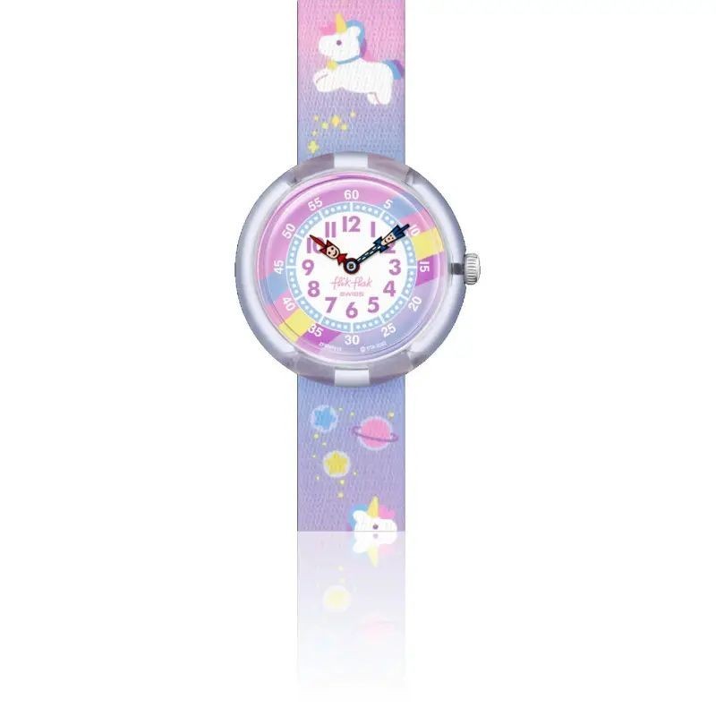 Montre FLIK FLAK, Mouvement quartz, boitier plastique (diam. 30mm), fond blanc, bracelet textile avec motifs.