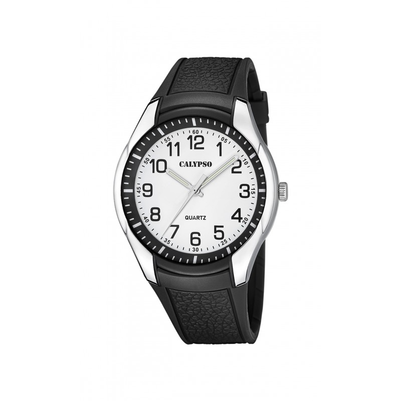 Montre CALYPSO, Mouvement quartz, boitier resine (diam. 26mm), fond blanc, bracelet resine noir. Etanchéité: 10 ATM. Garantie 2 ans