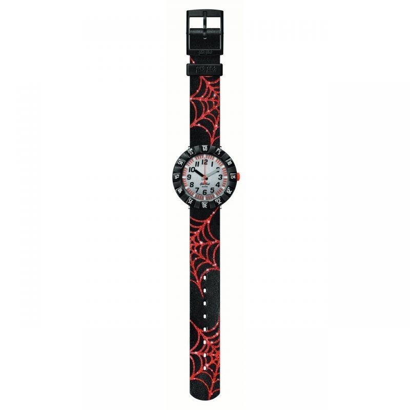 Montre FLIK FLAK, Mouvement quartz, boitier plastique (diam. 35mm), fond argent, bracelet textile noir et rouge. Etanchéité: 3 ATM. Garantie 2 ans