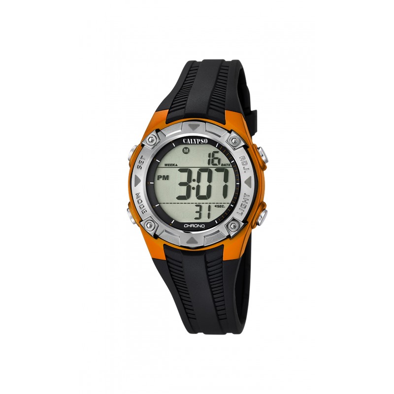 Montre CALYPSO, Mouvement quartz + dateur, boitier résine (diam. 37mm), affichage digital, bracelet résine noir. Fonction: Chronomètre, alarme, compte à rebours, 2eme fuseau horaire.