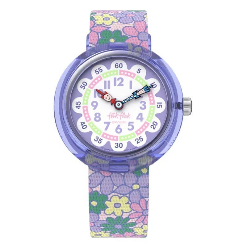 Montre FLIK FLAK, Mouvement quartz, boitier plastique (diam. 30mm), fond blanc, bracelet textile violet avec fleurs.