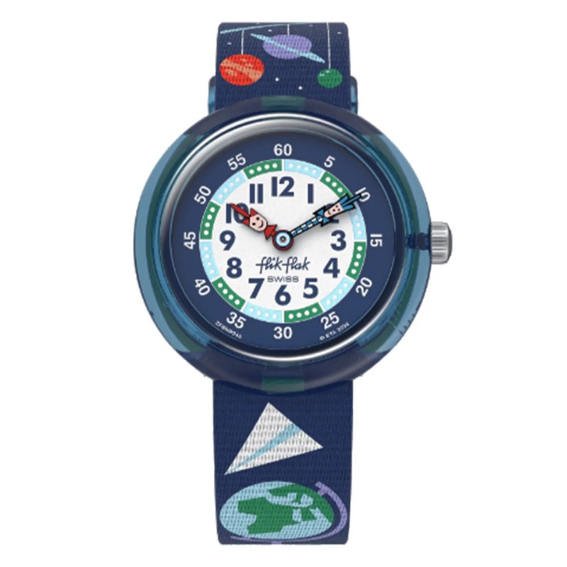 Montre FLIK FLAK, Mouvement quartz, boitier plastique (diam. 30mm), fond blanc, bracelet textile bleu avec des planètes.