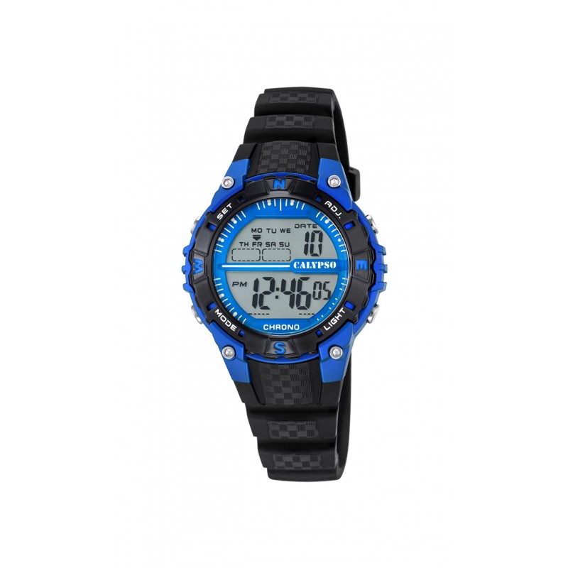 Montre CALYPSO, Mouvement quartz + dateur, boitier resine (diam. 38mm), affichage digital, bracelet resine noir. Fonction: Chronomètre, alarme, compte à rebours et 2ème fuseau horaire.