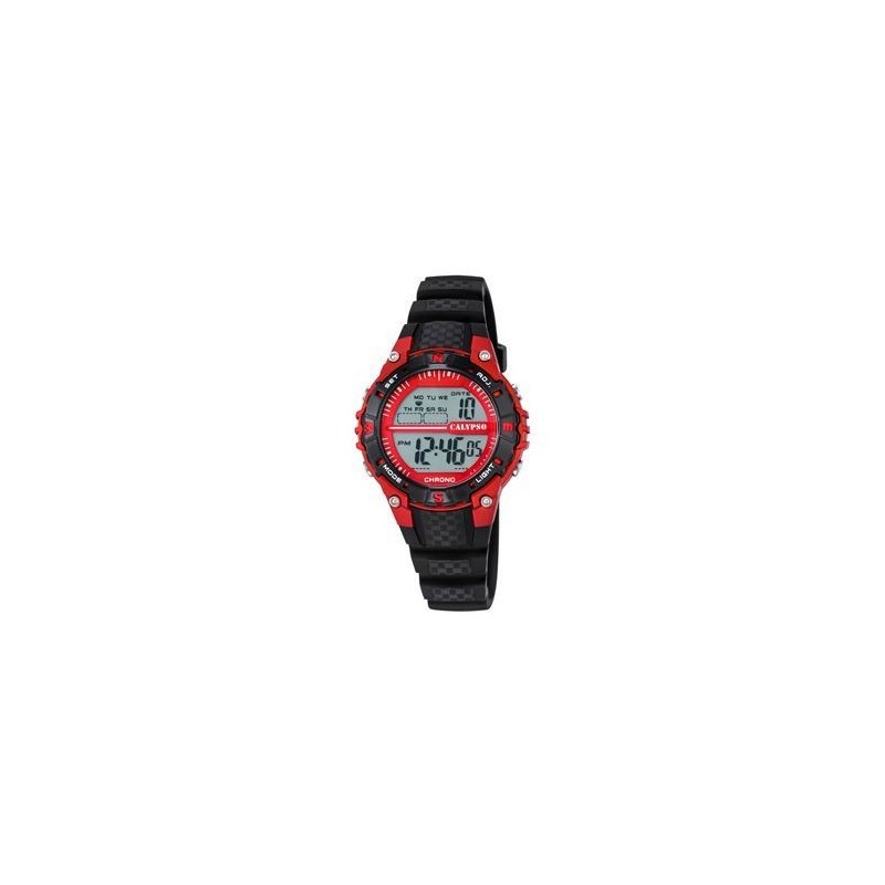 Montre CALYPSO, Mouvement quartz + dateur, boitier resine (diam. 42mm), affichage digital, bracelet resine noir. Fonction: Chronomètre, alarme, compte à rebours et 2ème fuseau horaire.