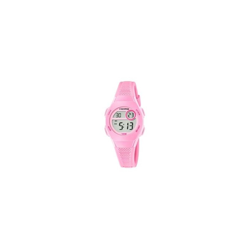 Montre CALYPSO, Mouvement quartz + dateur, boitier resine (diam. 28mm), affichage digital, bracelet resine rose. Fonctions: Chronomètre, alarme, compte à rebours. Etanchéité: 10 ATM. Garantie 2 ans