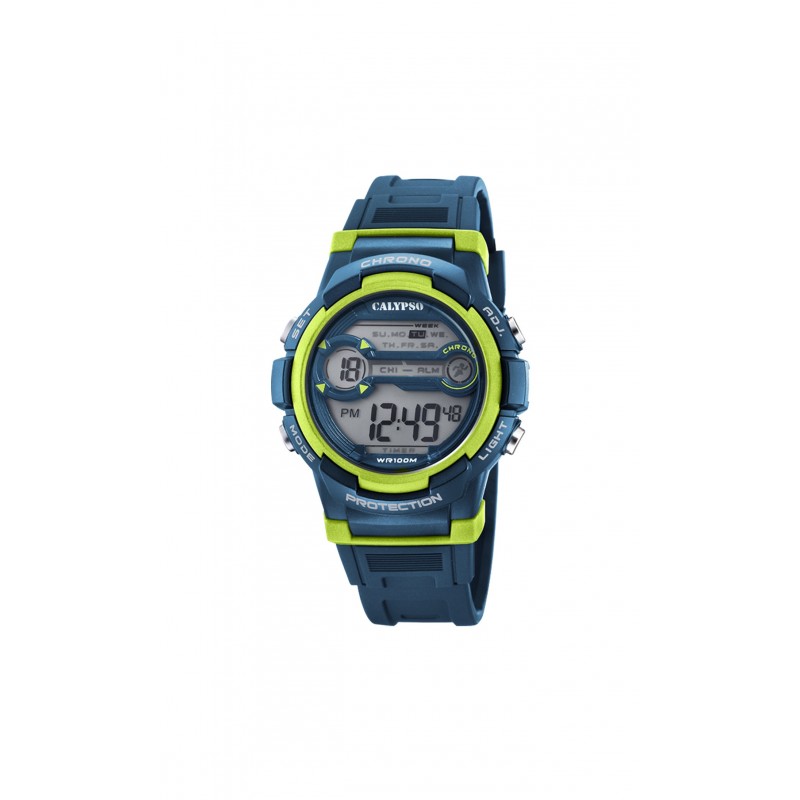 Montre CALYPSO, Mouvement quartz + dateur, boitier resine (diam. 40mm), fond affichage, bracelet resine bleu. Fonctions: Chronomètre, alarme, compte à rebours, 2 ème fuseau horaire.