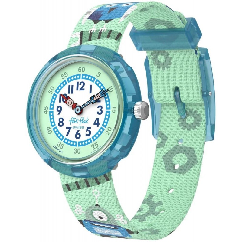 Montre FLIK FLAK, Mouvement quartz, boitier plastique (diam. 30mm), fond blanc et vert, bracelet textile vert avec motifs.