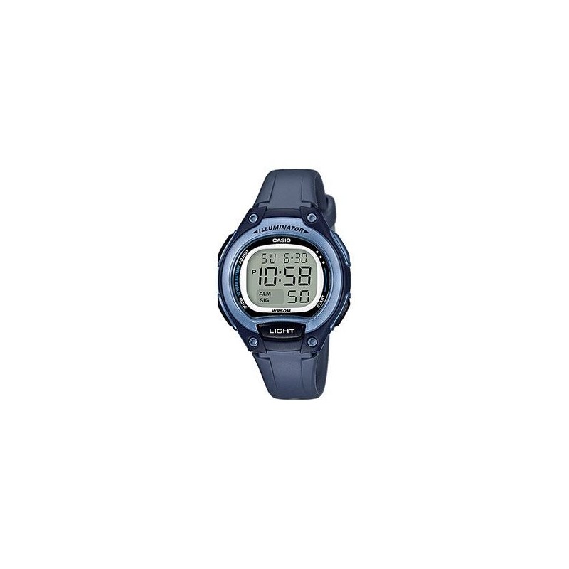 Montre CASIO, Mouvement quartz + dateur, boitier résine (diam. 35mm), fond affichage, bracelet résine bleu. Fonction: Chronomètre, alarme, 2eme fuseau horaire.