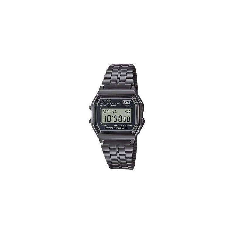 Montre CASIO, Mouvement quartz + dateur, boitier résine (diam. 33mm), fond affichage, bracelet acier noir. Fonction: Chronomètre, alarme.