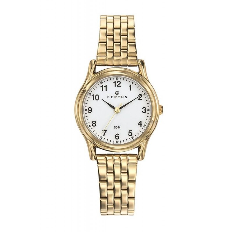 Montre CERTUS, Mouvement quartz, boitier acier (diam. 28mm), fond blanc, bracelet acier doré.