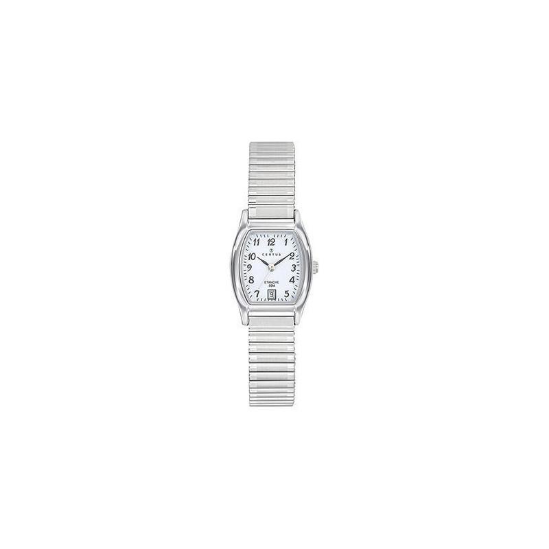 Montre CERTUS, Mouvement quartz + dateur, boiter acier (diam. 22mm), fond blanc, bracelet acier extensible.