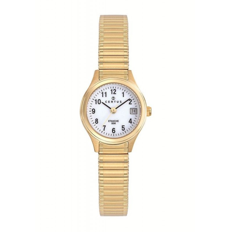 Montre CERTUS, Mouvement quartz + dateur, boitier acier (diam. 21mm), fond blanc, bracelet acier extensible doré.