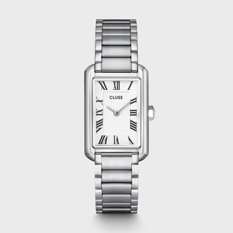 Montre CLUSE, Mouvement quartz, boitier acier (diam. 21mm), fond blanc, bracelet acier.