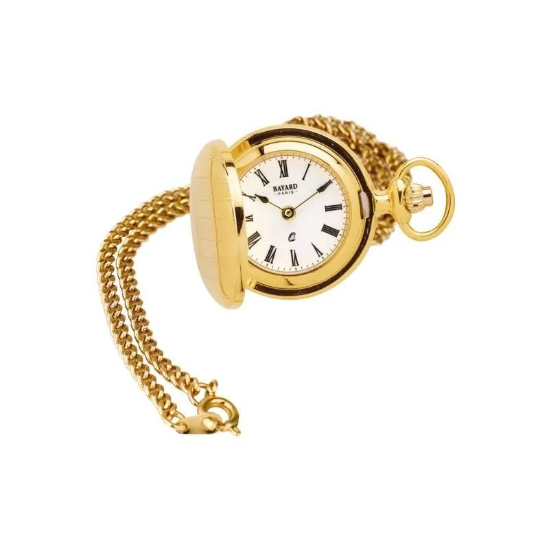 Montre pendentif, Mouvement quartz, boitier doré (diam. 26mm), fond blanc, chaine en laiton doré.