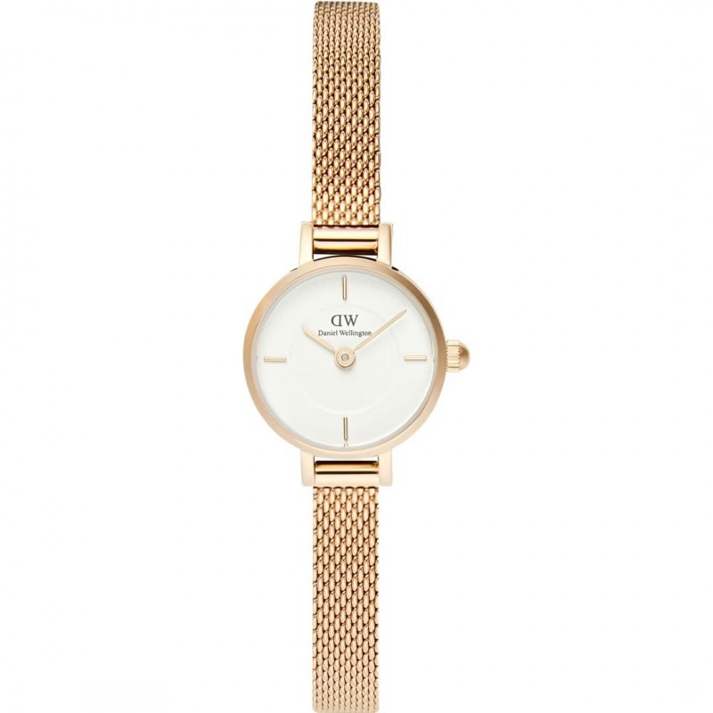 Montre DANIEL WELLINGTON, Mouvement quartz, boitier acier (19mm), fond blanc, bracelet acier milanais doré.