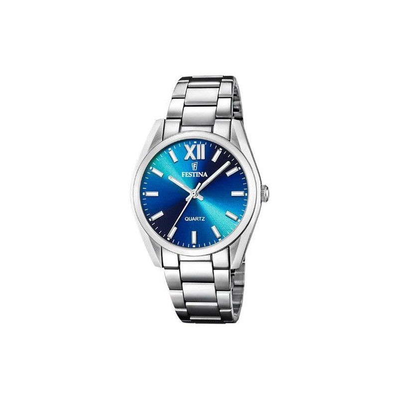 Montre FESTINA, Mouvement quartz, boitier acier (diam. 37mm), fond bleu, bracelet acier.