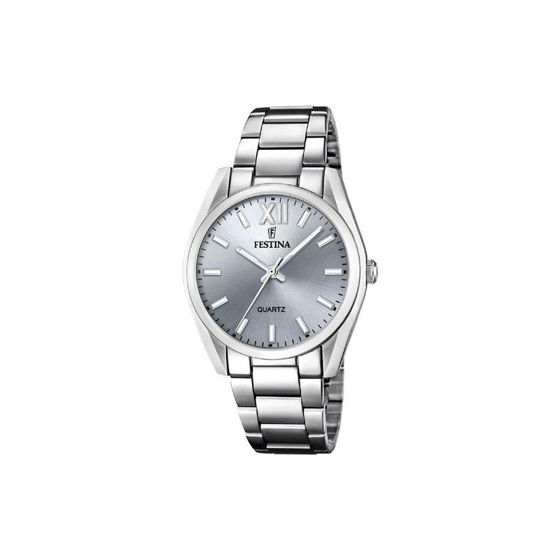 Montre FESTINA, Mouvement quartz, boitier acier (diam. 37mm), fond gris, bracelet acier.