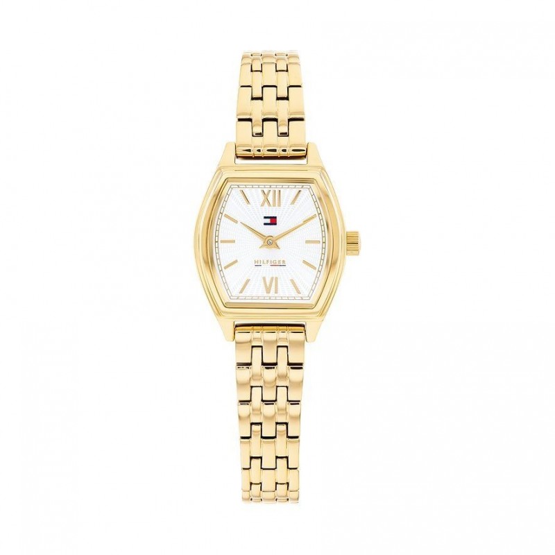 Montre TOMMY HILFIGER, Mouvement quartz, boitier acier (diam: 22mm), fond blanc, bracelet acier doré.