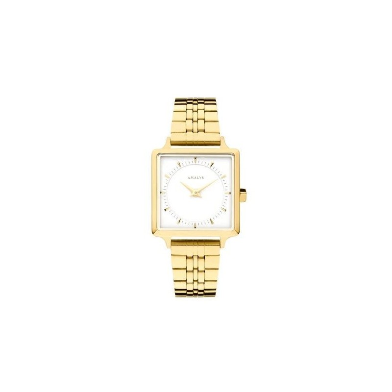 Montre AMALYS, Mouvement quartz, boitier acier (diam. 25mm), fond blanc, bracelet acier doré.