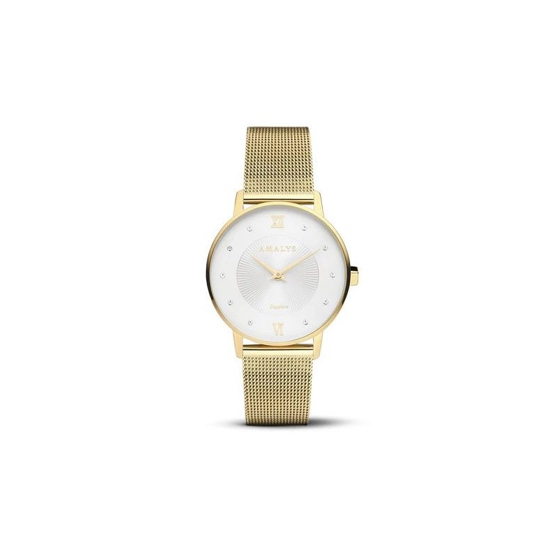 Montre AMALYS, Mouvement quartz, boitier acier (diam. 33mm), fond blanc, bracelet acier milanais doré.
