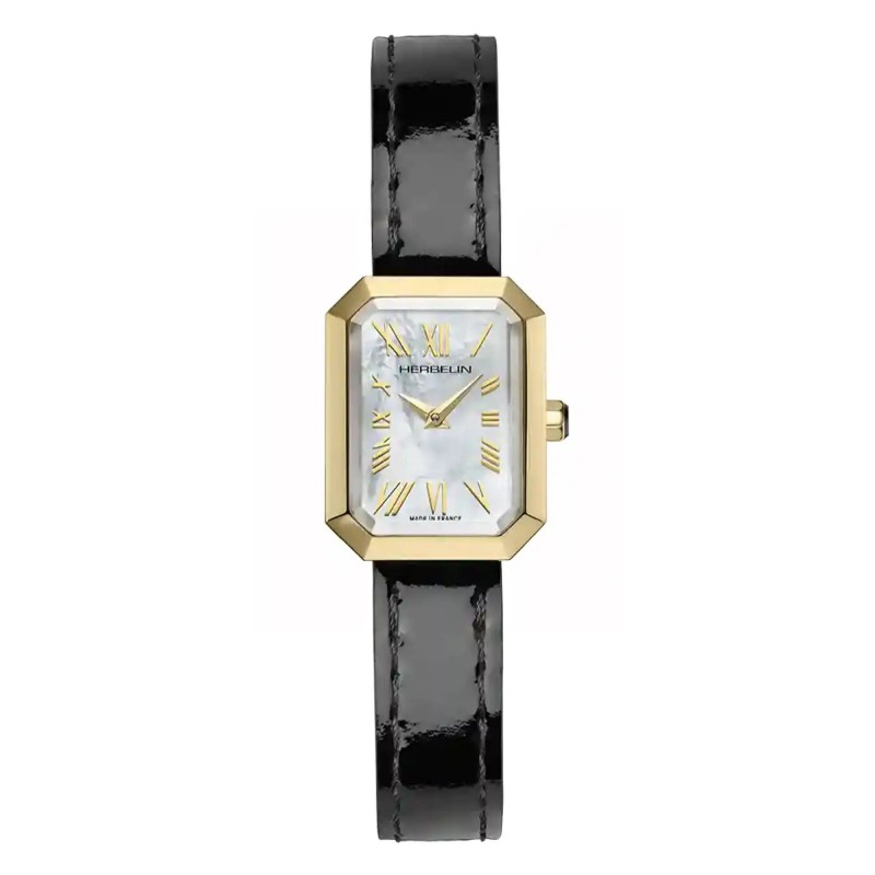 Montre HERBELIN, Mouvement quartz, boitier acier (20.40 x 26.40mm), verre saphir, fond nacre blanche, bracelet cuir noir avec boucle traditionnelle.