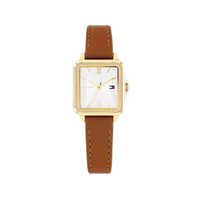 Montre TOMMY HILFIGER, Mouvement quartz, boitier acier (diam. 23mm), fond blanc, bracelet cuir marron.