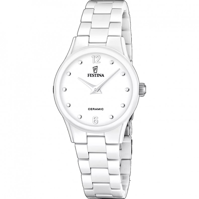 Montre FESTINA, Mouvement quartz, boitier acier (diam. 30.5mm), fond blanc, bracelet céramique blanc.