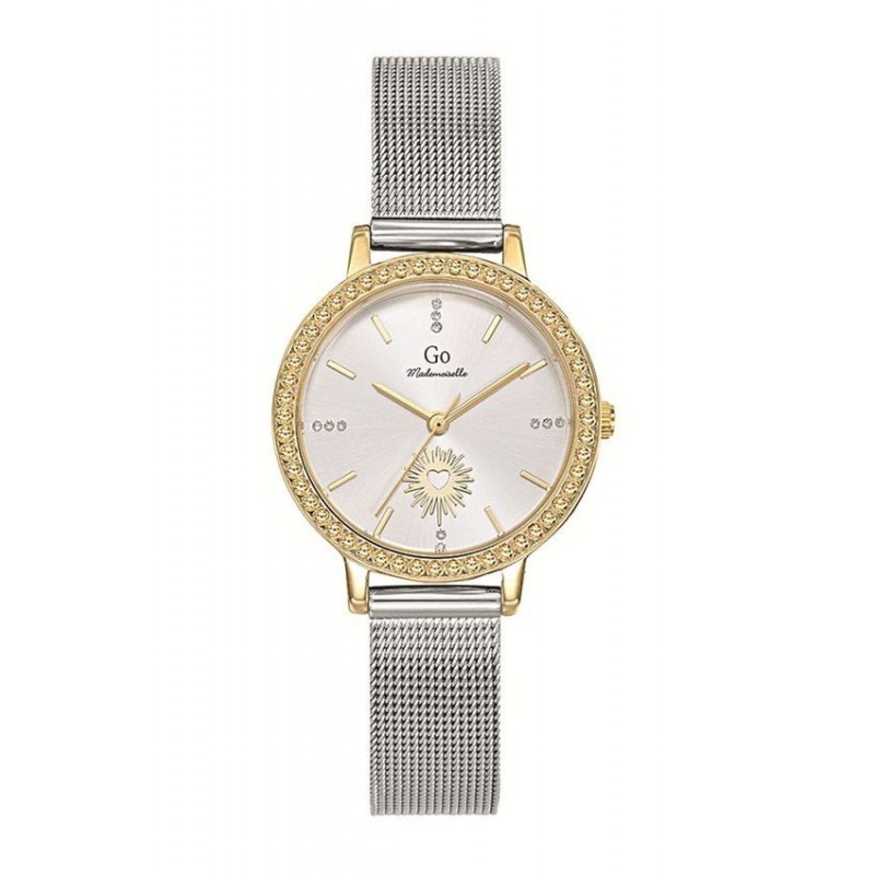 Montre GO, Mouvement quartz, boitier acier (diam. 32mm), fond argenté, bracelet acier milanais.