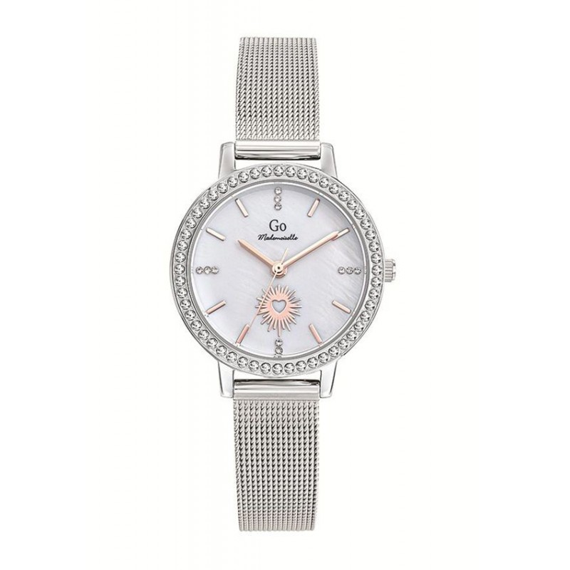 Montre GO, Mouvement quartz, boitier acier (diam. 32mm), fond nacre, bracelet acier milanais.