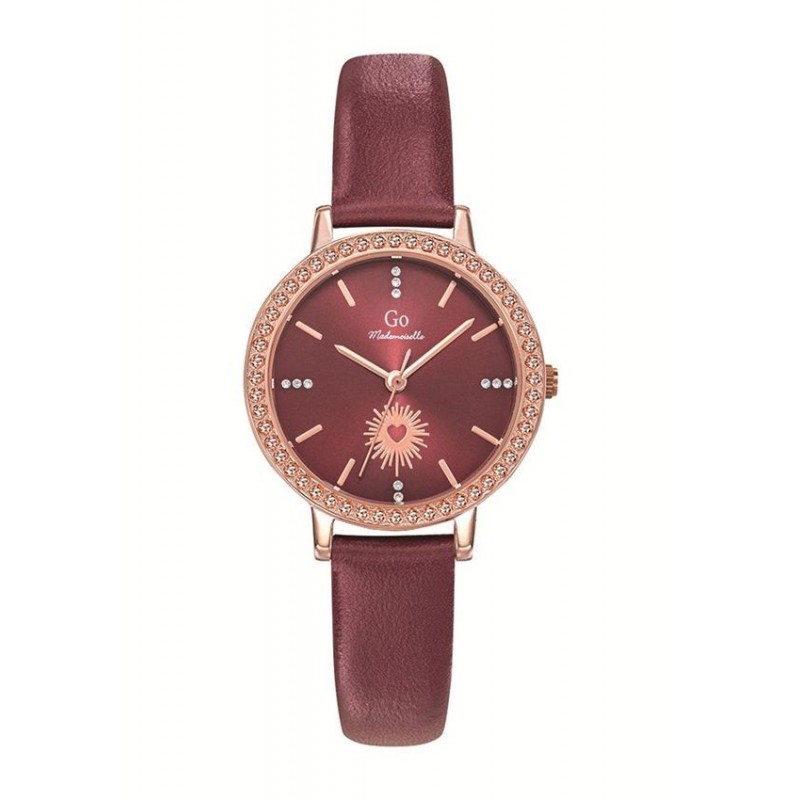 Montre GO, Mouvement quartz, boitier acier (diam. 32mm), fond rouge, bracelet cuir rouge.