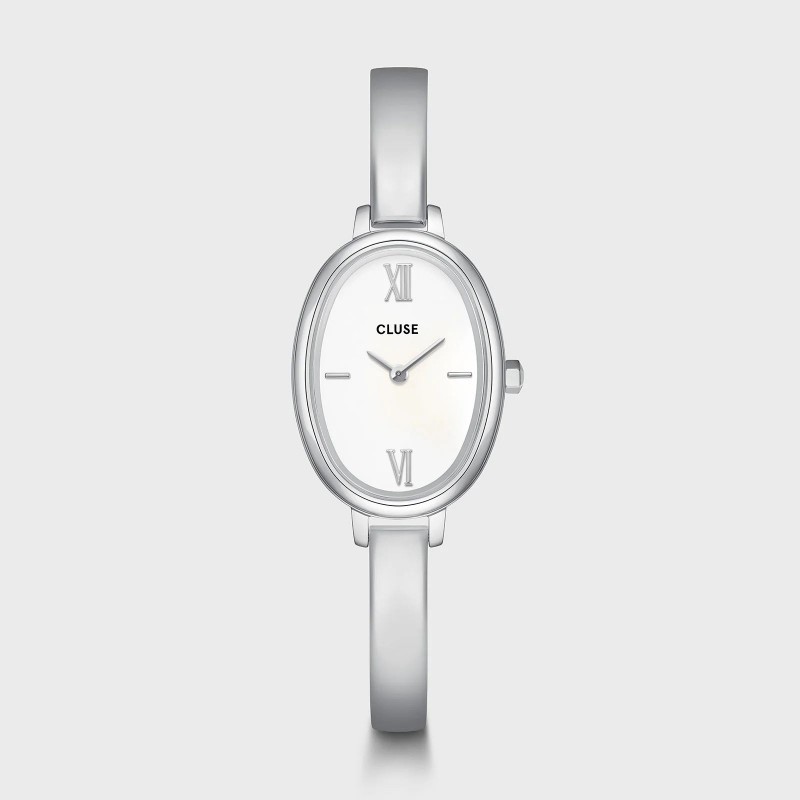 Montre CLUSE, Mouvement quartz, boitier acier (diam. 22mm), fond blanc, bracelet acier.