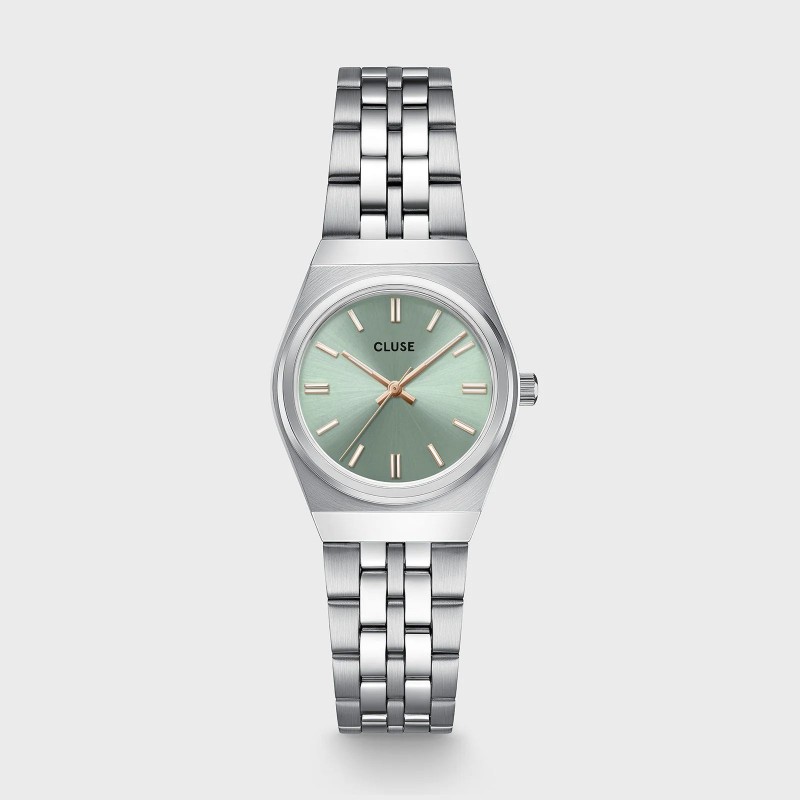 Montre CLUSE, Mouvement quartz, boitier acier (diam. 26mm), fond vert, bracelet acier.