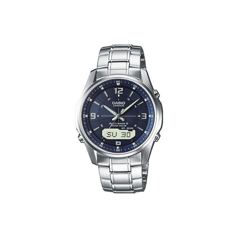 Montre CASIO, Mouvement quartz + dateur, boitier acier (diam. 40mm), fond bleu et affichage, bracelet acier. Fonction: Chronomètre, alarme, compte à rebours, heure universelle. Etanchéité: 5 ATM. Garantie 2 ans