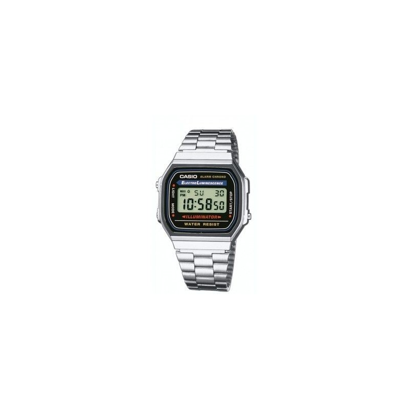 Montre CASIO, Mouvement quartz + dateur, boitier résine (diam. 38mm), fond affichage, bracelet acier. Fonction: Chronomètre, alarme.