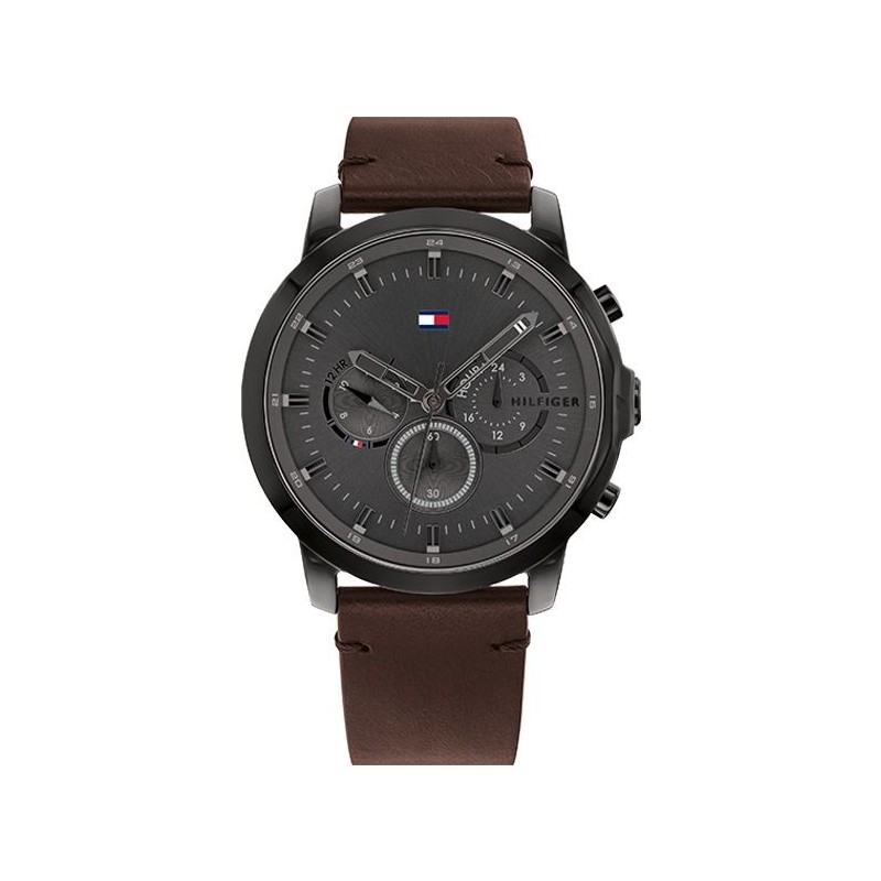 Montre TOMMY HILFIGER, Mouvement quartz, boitier acier (diam: 44mm), fond gris, bracelet cuir marron. Fonction: Chronomètre.