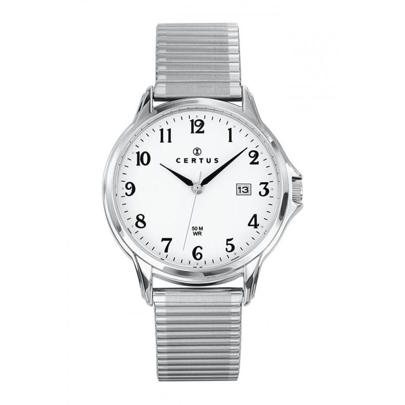 Montre CERTUS, Mouvement quartz + dateur, boitier acier (diam. 38mm), fond blanc, bracelet acier extensible.