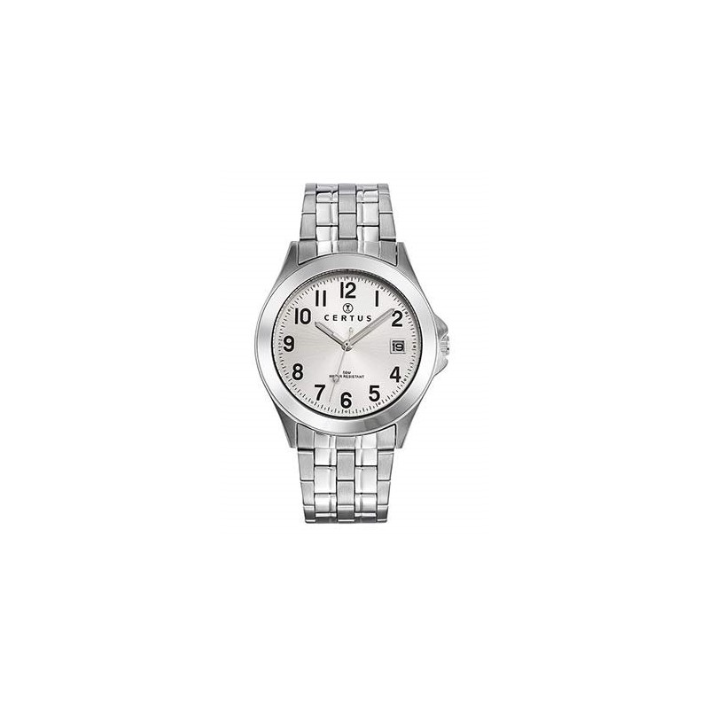 Montre CERTUS, Mouvement quartz + dateur, boitier acier (diam. 39mm), fond argent, bracelet acier.