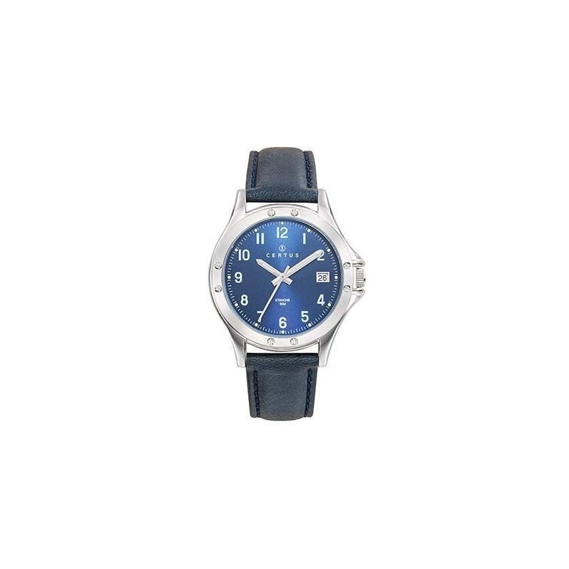 Montre CERTUS, Mouvement quartz + dateur, boiter acier (diam. 39mm), fond bleu, bracelet cuir bleu.