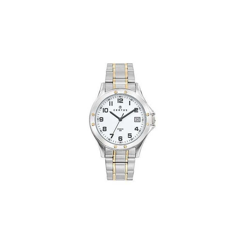 Montre CERTUS, Mouvement quartz + dateur, boiter acier (diam. 39mm), fond blanc, bracelet acier bicolore.