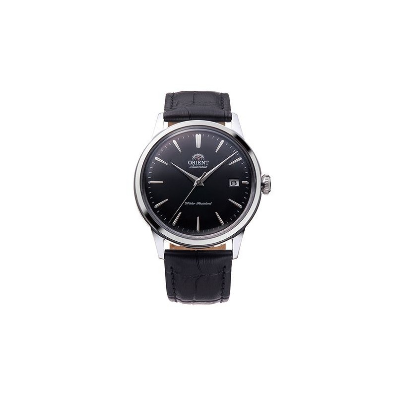 Montre ORIENT, Mouvement automatique + dateur, boitier acier (diam. 38mm), fond noir, bracelet cuir noir.